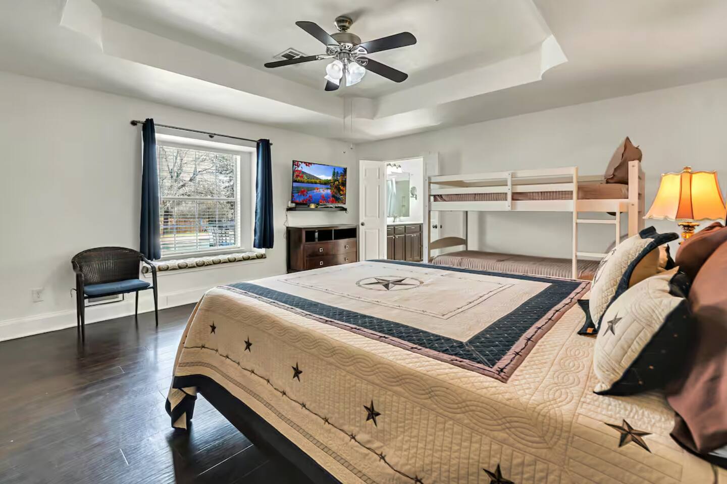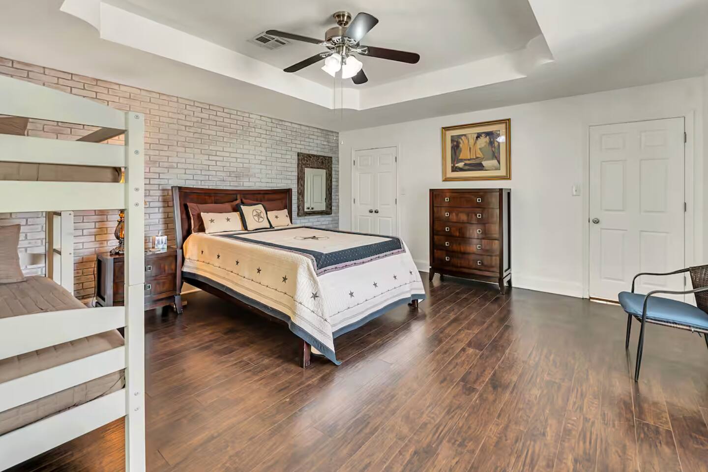 INSIDE THE HOME: Primary Bedroom – A restful retreat with a queen bed, soft linens, and plenty of storage. Large windows fill the room with natural light, creating a calm and comfortable space to recharge. Bedroom 2 – Another inviting space with a queen bed and cozy touches that make it perfect for couples or solo travelers needing quiet rest. Bedroom 3 – Designed with flexibility in mind, this room includes a queen bed and a twin-over-full bunk bed—great for families, kids, or groups who need a little extra sleeping space. Additional Sleeping – A king-size air mattress is available upon request to bring total capacity up to 10 guests. LIVING SPACES: Living Room – A welcoming hub of the home with plush seating and a smart TV. Whether it’s a family movie night, cheering on Baylor, or winding down after exploring Waco, this space is perfect for gathering. Dining Area – The dining table seats 6+, making it great for meals, card games, or conversation that lingers late into the evening. Kitchen – Fully stocked with everything you need for home-cooked meals or simple snacks. Includes modern appliances, cookware, dishes, serving platters, and a Keurig coffee maker with starter pods. EXTRAS: Two Full Bathrooms – The primary bathroom includes a walk-in shower and double vanity. The second bathroom, shared by Bedrooms 2 and 3, offers a full tub/shower combo and guest essentials. Laundry Closet – Washer and dryer available for guest use, making extended stays simple and convenient. OUTDOOR SPACE: The resort-style pool and backyard are the crown jewel of Oak & Anchor Villa. The sparkling swimming pool, bubbling hot tub, and wide-open skies make this a private retreat you’ll never want to leave. Pool & Spa – Perfect for cooling off in the Texas heat or stargazing at night from the hot tub. Outdoor Dining – A pellet grill and patio table provide the perfect setup for alfresco meals. Spacious Yard – Plenty of room to gather, lounge, or just enjoy the peaceful views of the countryside. Pool towels are provided for your convenience. ADDITIONAL AMENITIES: High-speed WiFi. Keyless smart lock for easy self-check-in. Private parking. Air mattress available upon request. A NOTE: Oak & Anchor Villa is more than just a getaway—it’s a place of rest, renewal, and connection. Tucked just across Lake Waco and steps away from The Gaines’ original farmhouse, this home is filled with thoughtful details to make your stay memorable. We pray each guest experiences peace, joy, and comfort here. May this home be your gathering place, your retreat, and your reminder that the Texas countryside is always ready to welcome you back. When you think of Waco, we hope you’ll smile and say, “We’ve got a place there.”