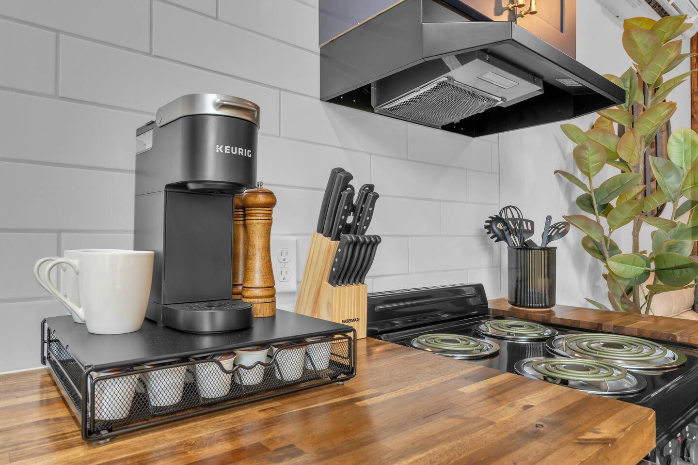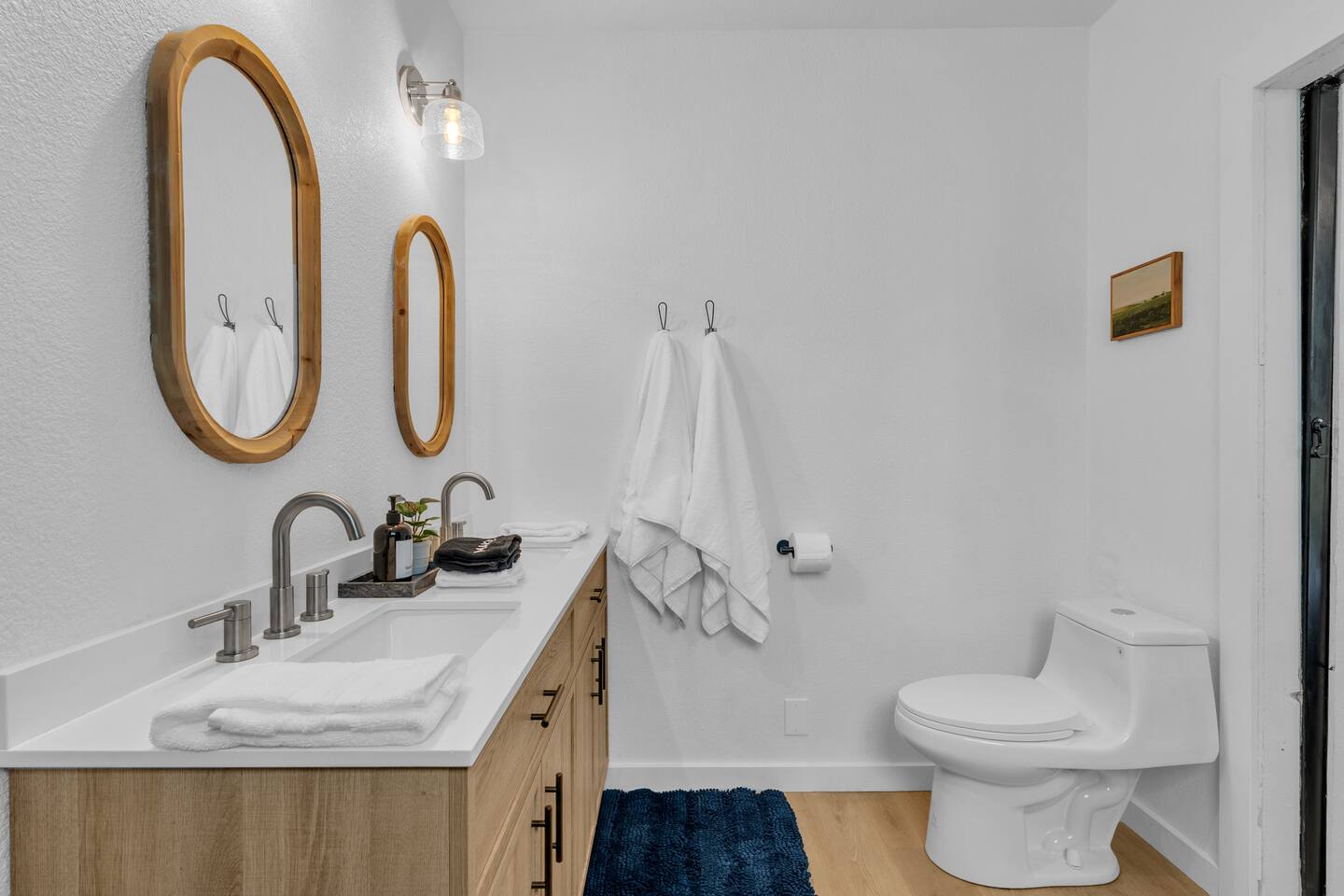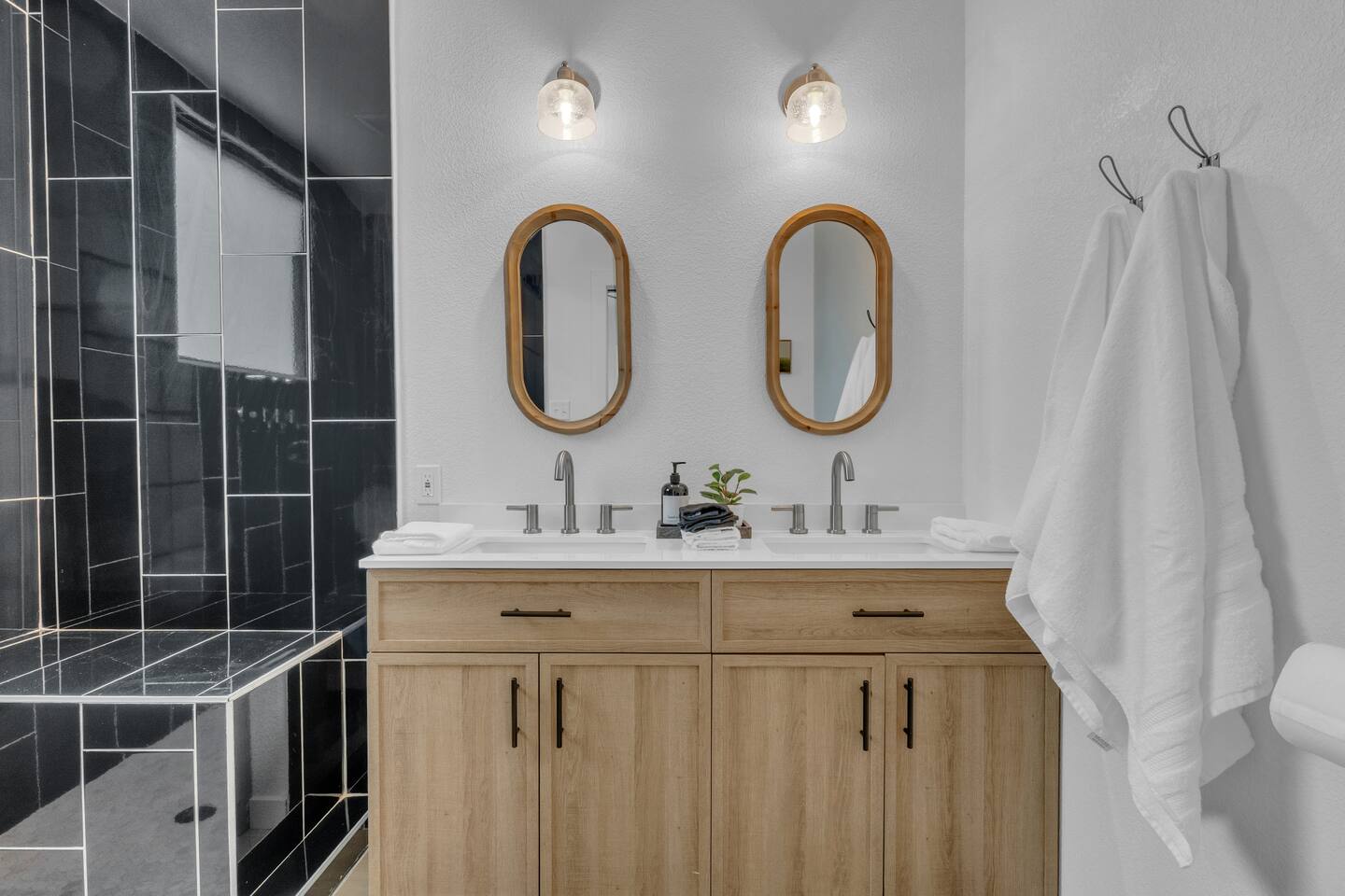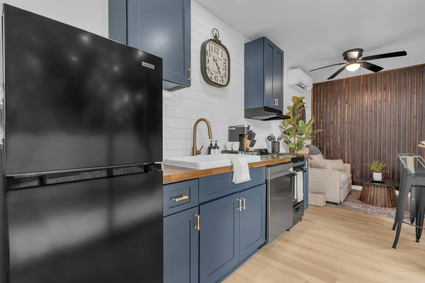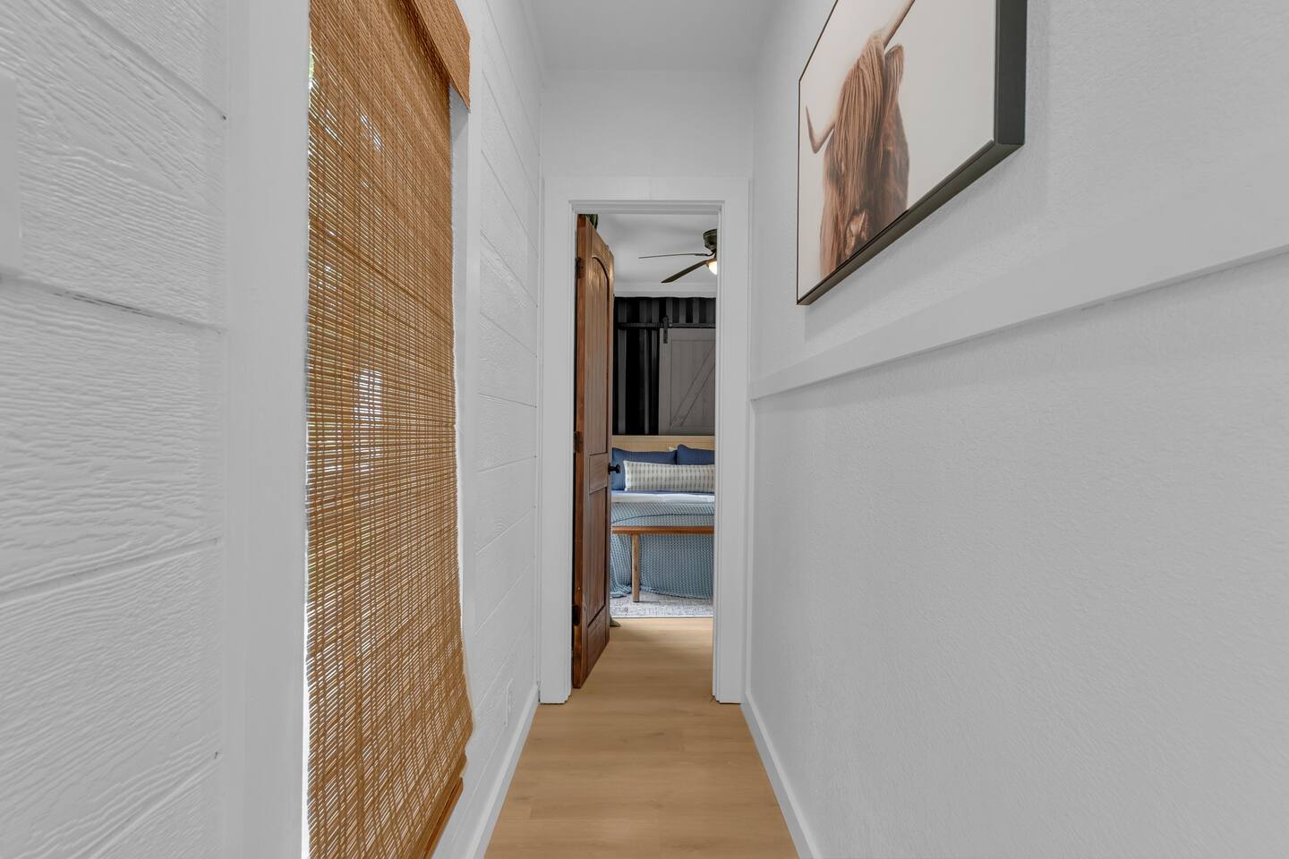 INSIDE THE HOME: Sleeping Area – A cozy retreat featuring a full-size bed with plush linens, and thoughtfully curated décor. The space is designed for comfort and serenity, with custom millwork and fun yet functional finishes that elevate the experience. Living Area – Bright and inviting, the living space includes a sleeper sofa, smart TV, and sleek accent pieces. Whether you’re relaxing after a day in Brenham or starting your morning slow with coffee, this space offers calm and comfort. Kitchen – Small but mighty, this fully equipped kitchen features a full-size fridge, microwave, electric range, and everything you need from full meals to snack prep. Custom cabinetry and countertops, and designer touches make even the simple moments feel special. Bathroom – The spa-inspired bathroom includes a walk-in shower, beautiful vanity, luxe tilework, and gold fixtures. Spacious and beautifully lit, it’s one of the most surprising features of the home—elevating your stay beyond typical tiny home living. Laundry Closet – A stacked washer and dryer set is tucked neatly into the hallway closet, making longer stays easy and convenient. OUTDOOR SPACE: Step outside to enjoy your own over-sized private patio area—perfect for morning coffee or a quiet evening glass of wine. Surrounded by peaceful vibes and natural charm, it’s the ideal spot to unwind and soak in small-town Texas at its best. ADDITIONAL AMENITIES: Need more space? The BLUE Belle shares the property with its sister unit, The BLUE Bonnet. Both can be booked together for added flexibility—ideal for couples, friends, or small groups traveling together. We’ve stocked the home with the same care we’d want for our own travels—from quality linens and blackout curtains to local recommendations and a fully loaded welcome guide. A NOTE: The BLUE Belle is more than a clever tiny home—it’s a labor of love designed to bring peace, joy, and a moment of stillness in the middle of a busy world. Every detail was chosen with intention, and our prayer is that it blesses your rest, sparks connection, and invites you to slow down, even if just for a while. Whether you’re visiting for a girls’ trip, wedding weekend, antique festival, or quiet reset—we hope you’ll remember your time here with warmth and look forward to coming back.