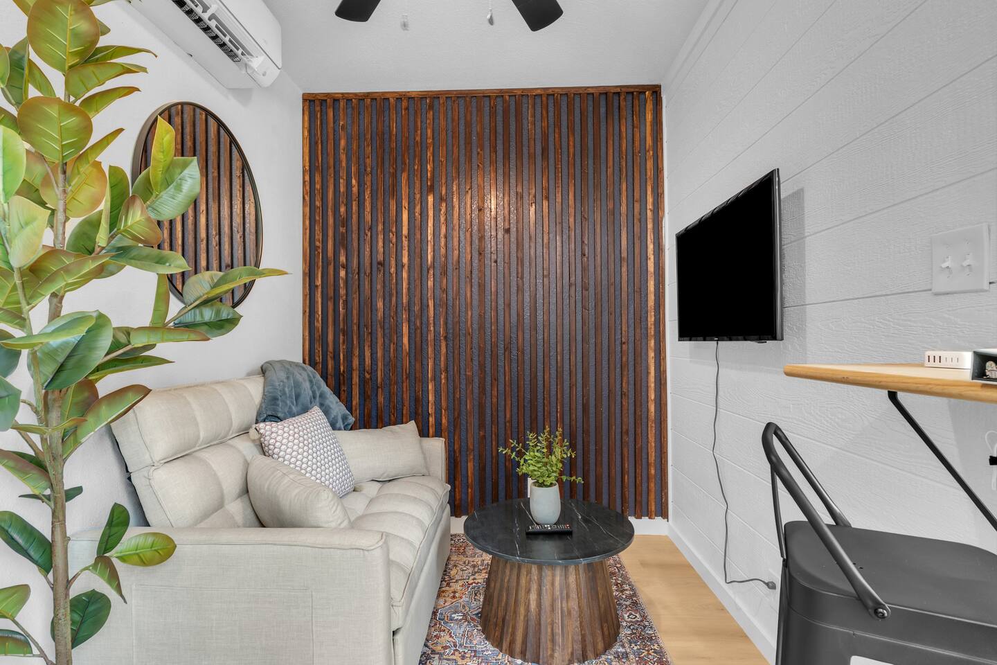 Guests have full access to their private container home, including the living area, kitchen, bedroom(s), bathroom, laundry access (if applicable), and the spacious patio along the front porch of their unit. Self-check-in is simple using the lockbox. You’ll receive a custom code that provides access to the key for the duration of your stay. This property is a duplex-style container home, and the only shared feature between the two vacation rentals is the driveway. Each container has one reserved driveway parking spot. Additional vehicles may use street parking, if guests are comfortable with that. Please note: parking is not guaranteed or warranted, as availability can vary based on neighborhood activity. Your container home is fully private for your stay—there are no shared interior spaces between the two units.